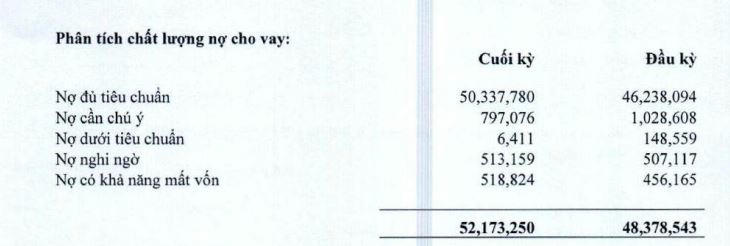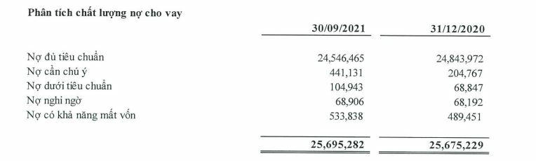 Thực tế, giảm mạnh chi phí dự phòng rủi ro tín dụng nhưng nợ xấu tại VietABank tính đến 30/9/2021 cũng chỉ giảm nhẹ 7% so với đầu năm, ghi nhận hơn 1.038 tỷ đồng. Trong đó, nợ có khả năng mất vốn tăng 14% lên gần 519 tỷ đồng; nợ dưới tiêu chuẩn giảm 96% xuống còn 6,4 tỷ đồng.