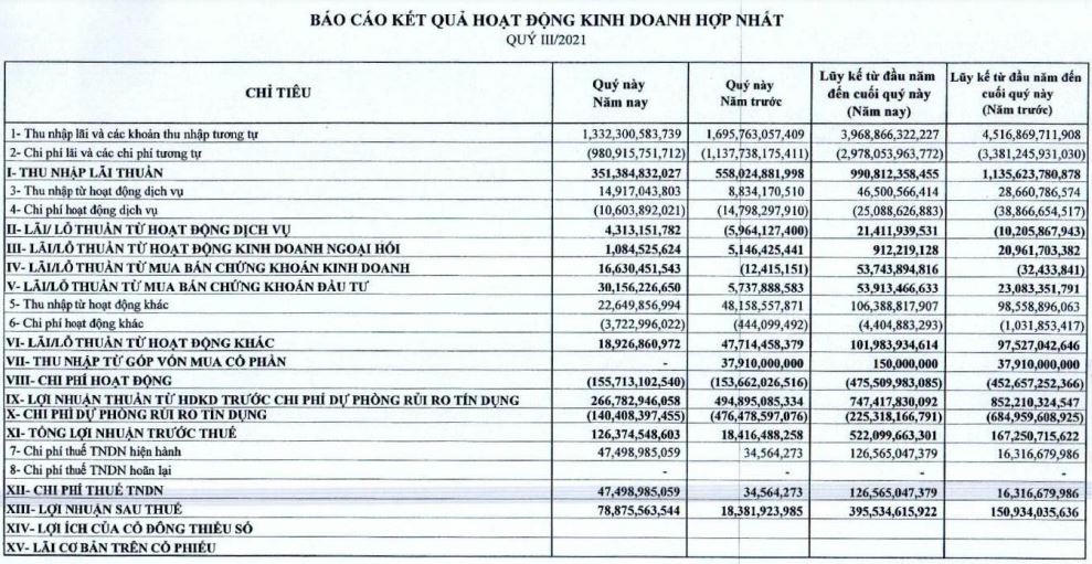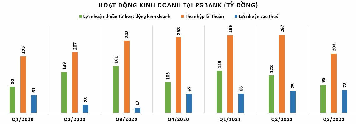 Lợi nhuận thuần từ hoạt động kinh doanh trong quý 3/2021 đã giảm gần 41% so với cùng kỳ, xuống còn 95,3 tỷ đồng. Tuy nhiên, PGBbank không trích dự phòng mà được hoàn nhập hơn 1,7 tỷ đồng, do đó, Ngân hàng báo lãi trước thuế gấp 4,6 lần cùng kỳ, ghi nhận 97 tỷ đồng.