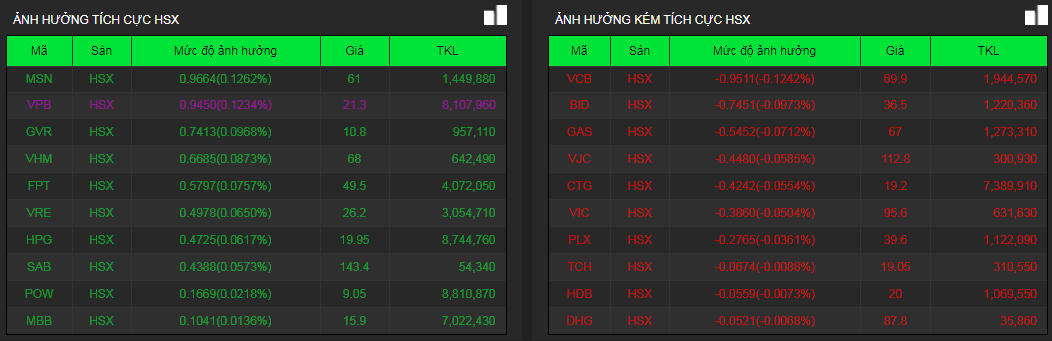 VN-Index may mắn giữ được sắc xanh vào cuối phiên nhờ động lực ở một số cổ phiếu lớn như VPB, FPT, MSN, HPG… Chốt phiên, VN-Index tăng 1,62 điểm (0,21%) lên 767,41 điểm. Toàn sàn có 167 mã tăng, 191 mã giảm và 68 mã đứng giá. HNX-Index giảm nhẹ 0,01 điểm (-0,01%) xuống 107,15 điểm. Toàn sàn có 57 mã tăng, 79 mã giảm và 61 mã đứng giá.