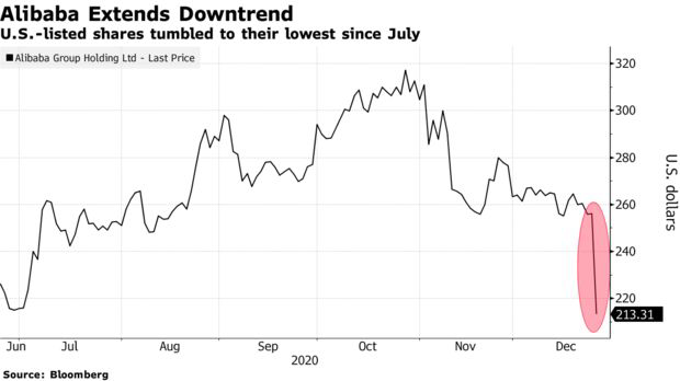 Ở phiên 24/12 tại Mỹ, cổ phiếu Alibaba giảm 13% – mức giảm kỷ lục trong 1 ngày. Sự sụt giảm này đã đưa cổ phiếu Alibaba xuống mức thấp nhất kể từ tháng 7 và mã này hiện giảm 30% so với mức đỉnh hồi tháng 10. Gần 141 triệu cổ phiếu được chuyển nhượng thành công phiên này – khối lượng giao dịch lớn nhất kể từ khi IPO vào năm 2014. Trong một thông báo, Alibaba cho biết họ sẽ hợp tác với các cơ quan quản lý trong cuộc điều tra và hoạt động hiện vẫn diễn ra bình thường.