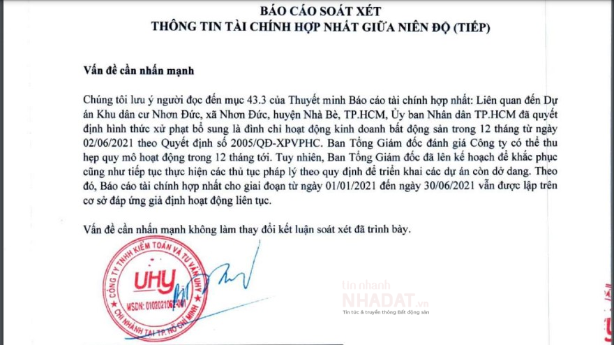 Nhiều năm trở lại đây, dự án bất động sản dù chưa đủ điều kiện mở bán theo quy định nhưng vẫn được rao bán diễn ra rầm rộ trên thị trường. Liên quan đến tình trạng ‘bán lúa non’, tại Báo cáo tài chính bán soát xét 6 tháng đầu năm 2021 mới đây của Công ty cổ phần Vạn Phát Hưng (mã cổ phiếu: VPH), doanh nghiệp đã bị kiểm toán lưu ý về quyết định xử phạt bổ sung liên quan đến dự án khu dân cư Nhơn Đức, huyện Nhà Bè, TP Hồ Chí Minh.