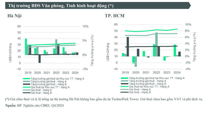 Về giá thuê, theo CBRE, giá thuê tại Hà Nội có xu hướng tăng nhẹ, đạt mức gần 1% so với năm 2023, khi xét toàn thành phố ở cả hai phân khúc. Trong khi đó, giá thuê tại TP HCM ghi nhận mức tăng trưởng tại khu vực trung tâm năm 2024 tăng 3,7% so với cùng kỳ năm trước, mức tăng cao nhất trong tất cả các phân khúc. Mức tăng trưởng giá này phần lớn được thúc đẩy bởi việc các tòa nhà mới dần được lấp đầy. Ba năm tới, nguồn cung tương lai dự kiến đạt gần 170.000m2 tại Hà Nội và hơn 100.000m2 tại TP HCM.