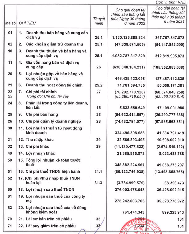 Về tình hình kinh doanh, theo Báo cáo tài chính hợp nhất giữa niên độ đã soát xét được công bố mới đây, doanh nghiệp ghi nhận doanh thu thuần 6 tháng đầu năm đạt 1.028 tỷ đồng, cao hơn gấp gần 3,3 lần so với cùng kỳ.