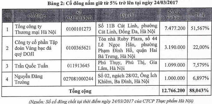 Năm 2017 Thực phẩm Hà Nội chính thức đưa toàn bộ 14,5 triệu cổ phiếu lên giao dịch trên sàn. Cơ cấu cổ đông tính đến 24/3/2017 có 4 cổ đông lớn, trong đó Tổng công ty Thương mại Hà Nội (Hapro) sở hữu 51,567% (7.477.200 cổ phiếu); Doji sở hữu 3.190.000 cổ phiếu (tỷ lệ 22%) và 2 cá nhân là ông Trần Quốc Tuấn và ông Nguyễn Đăng Trường lần lượt sở hữu 1.099.000 cổ phiếu và 1 triệu cổ phiếu.
