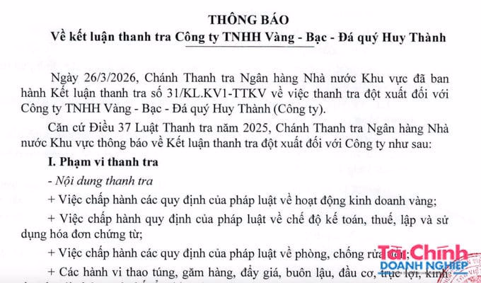 Thanh tra Ngân hàng Nhà nước (NHNN) Khu vực I mới đây đã thông báo Kết luận thanh tra đột xuất đối với Công ty TNHH Vàng bạc đá quý Huy Thành (Công ty Huy Thành - thương hiệu Huy Thanh Jewelry).