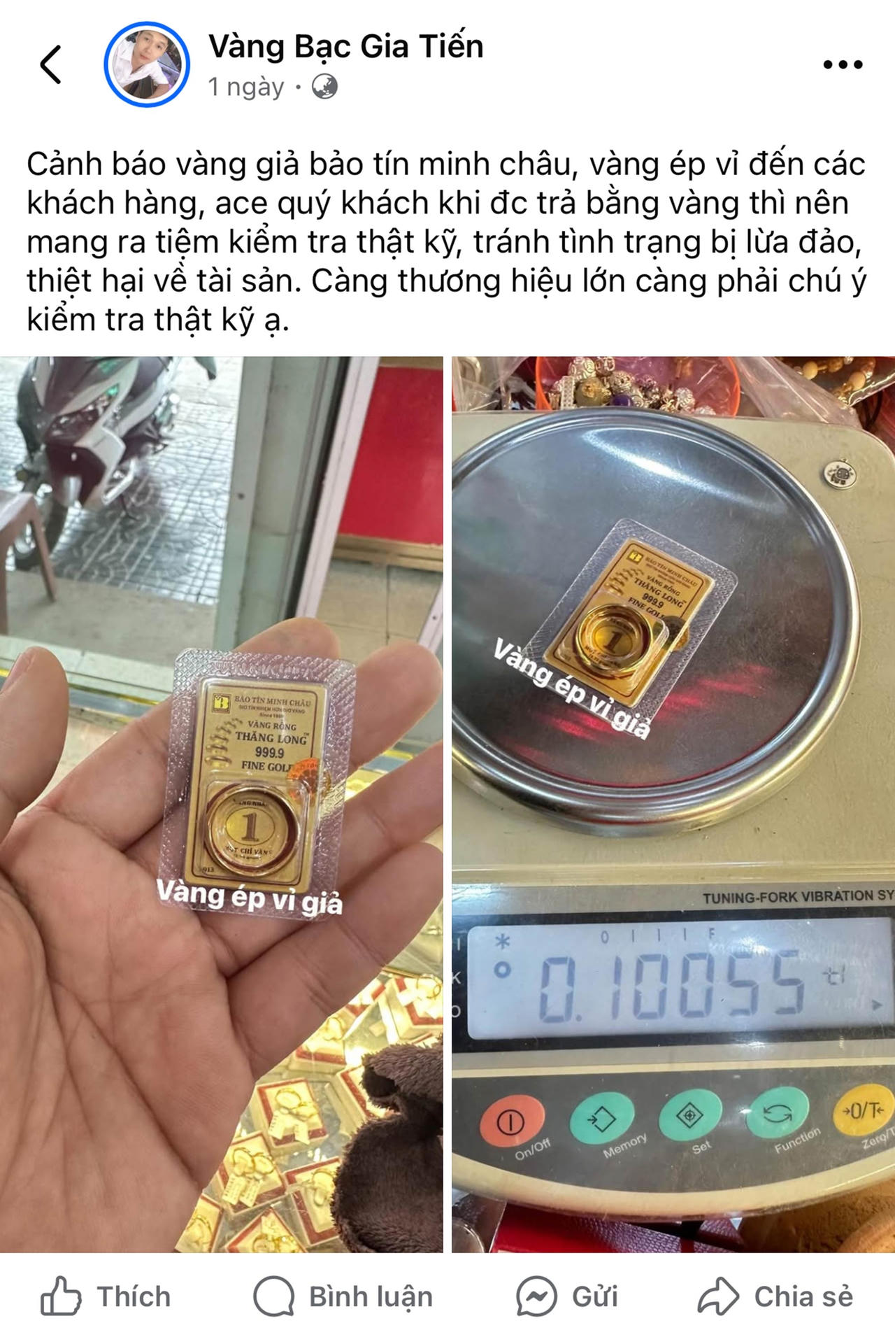 Xác định đây là vàng giả được làm nhái thương thiệu Bảo Tín Minh Châu, chủ cửa hàng này đã quay lại video và đăng lên mạng xã hội nhằm cảnh tỉnh các khách hàng ham rẻ, mua bán vàng trao tay trên mạng.