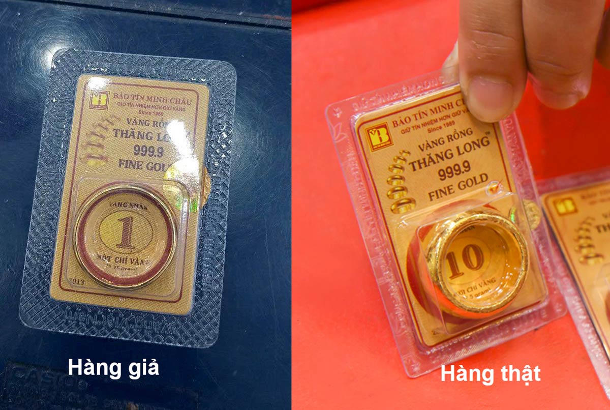 Nhưng qua quá trình kiểm tra, soi chiếu, cửa hàng vàng phát hiện vỉ vàng nhẫn này to hơn bình thường, phía xung quanh thân vỉ không được dập chữ Công ty Bảo Tín Minh Châu. Khi cân lên, vỉ vàng nhẫn này gồm cả vỏ không đủ định lượng. Tem mác cũng khác so với vàng thật của Bảo Tín Minh Châu, màu sắc không vàng óng như hàng thật.