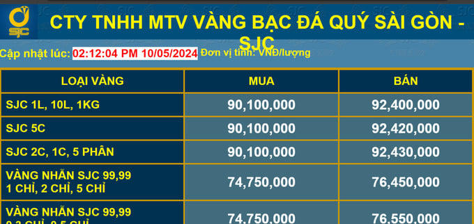 Tại thời điểm 14h12p ngày 10/5, Công ty vàng bạc đá quý Sài Gòn (SJC) niêm yết từ 89,90-92,43 triệu đồng/lượng, tăng 1,9 triệu đồng/lượng so với sáng nay và tăng 2,9 triệu đồng/lượng so với chốt phiên trước. Trong khi đó, Công ty Vietnam Gold niêm yết giá vàng SJC từ 89,90-92,10 triệu đồng/lượng (mua vào/bán ra), tăng 1,8 triệu đồng/lượng so với sáng nay và tăng 2,8 triệu đồng/lượng so với chốt phiên trước.