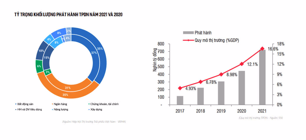 Phòng Phân tích và Nghiên cứu VARS nhận định, TPDN đã trải qua 4 năm phát triển mạnh mẽ với giá trị phát hành bùng nổ, đạt hơn 700 nghìn tỷ đồng, tương đương 16,7% GDP, gần 12% dư nợ tín dụng cả nước năm 2021. Đáng chú ý là TPDN bất động sản không ngừng tăng trưởng trong vài năm trở lại đây khi các chủ đầu tư ưu tiên sử dụng hình thức huy động vốn trái phiếu, hơn là các nguồn vốn từ ngân hàng hay nhà đầu tư, khách hàng.