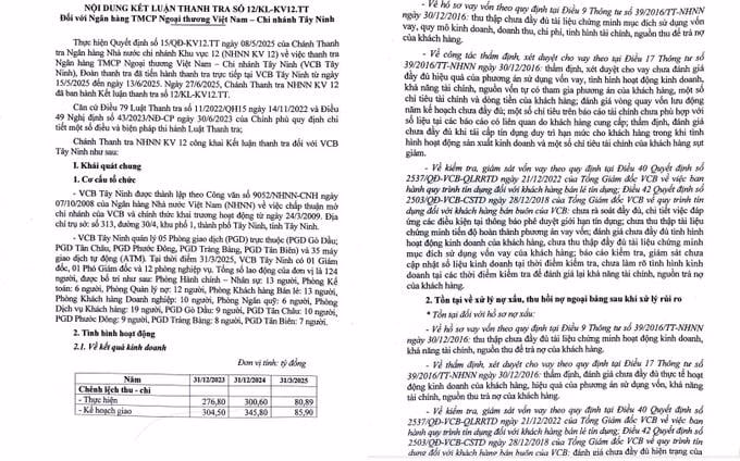 Theo Kết luận thanh tra, VCB Tây Ninh đã nỗ lực xây dựng và thực hiện các giải pháp để tăng trưởng tín dụng, triển khai các chương trình chính sách hỗ trợ, phục hồi nền kinh tế theo chủ trương, chính sách của Đảng, pháp luật của Nhà nước và của ngành ngân hàng.