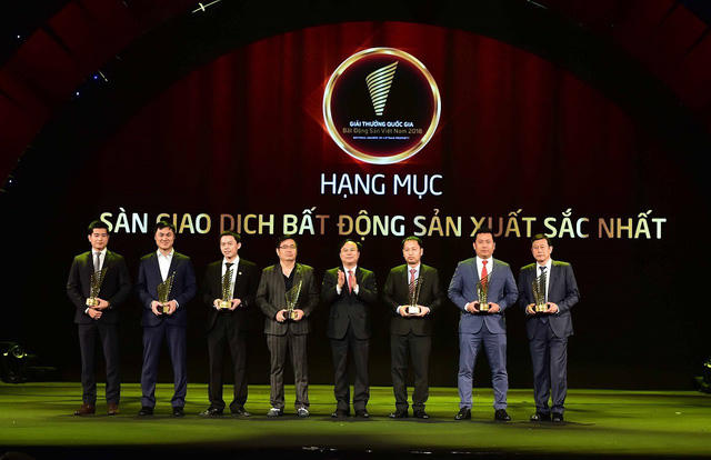 Đại diện Đất Xanh Miền Bắc – TGĐ.Vũ Cương Quyết (đứng thứ hai từ trái sang) vinh dự nhận giải thưởng Sàn giao dịch BĐS xuất sắc nhất