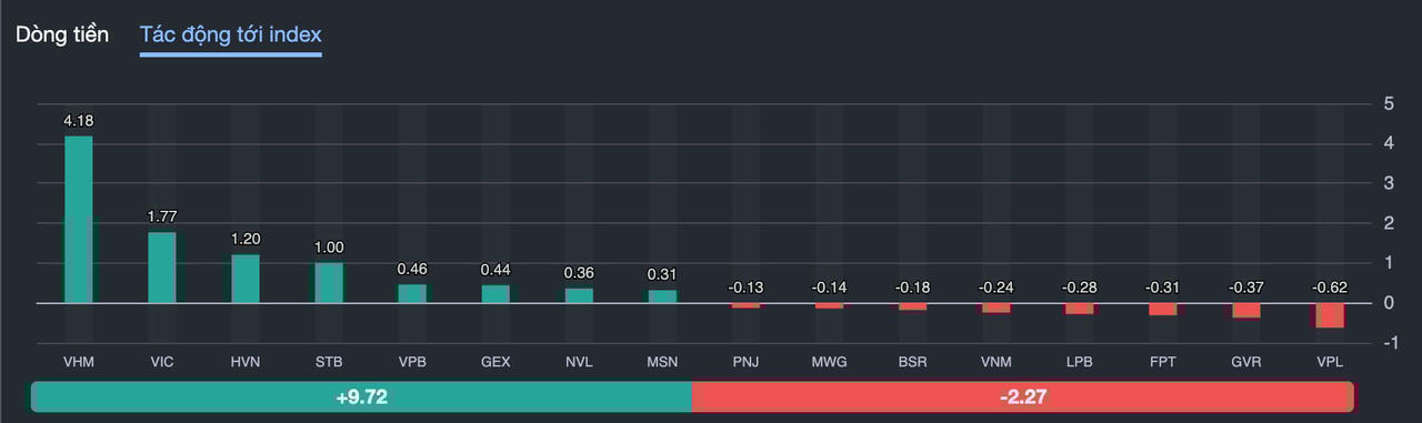Nhóm ngân hàng cũng ghi nhận diễn biến giằng co. Bên cạnh STB, VAB nổi bật với mức tăng 6%, trong khi các cổ phiếu lớn như TCB, BID, CTG, MBB, ACB, VCB chủ yếu dao động nhẹ quanh tham chiếu.