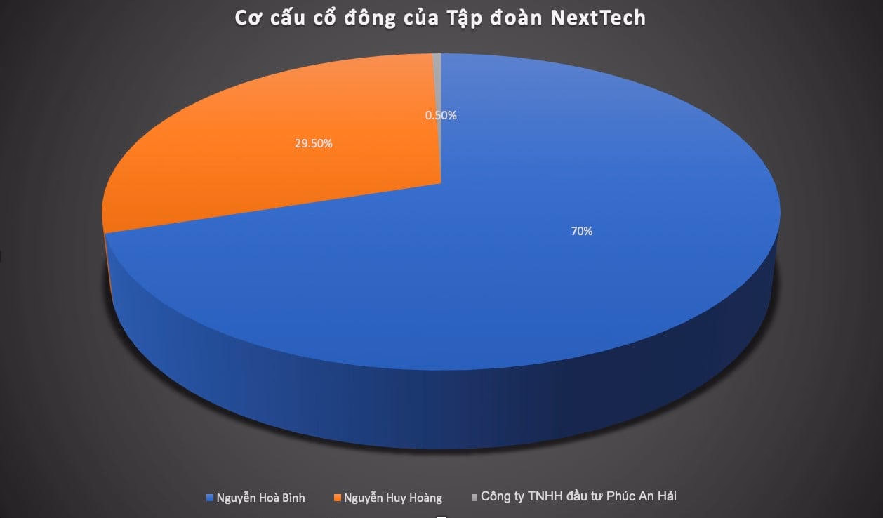 Dữ liệu doanh nghiệp mới nhất thể hiện cơ cấu sở hữu NextTech tiếp tục có sự biến động khi ông Nguyễn Hoà Bình nắm giữ 70% vốn, ông Nguyễn Huy Hoàng nắm giữ 29,5% và Công ty TNHH đầu tư Phúc An Hải (Phúc An Hải) nắm giữ 0,5%.
