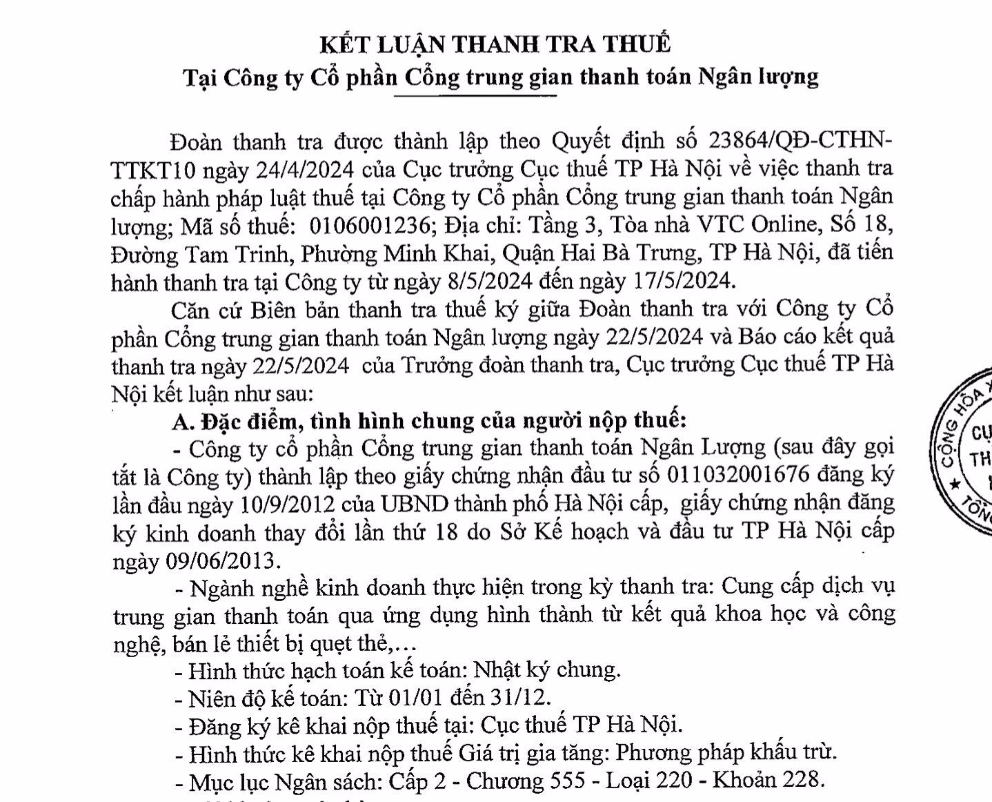 Theo kết luận thanh tra, công ty Ngân Lượng bị truy thu thuế giá trị gia tăng (GTGT), thu nhập doanh nghiệp (TNDN), thu nhập cá nhân (TNCN), thuế GTGT nộp thay cá nhân tăng thêm gần 910 triệu đồng. Tiền chậm nộp thuế tính đến ngày 21/5 là hơn 87 triệu đồng.