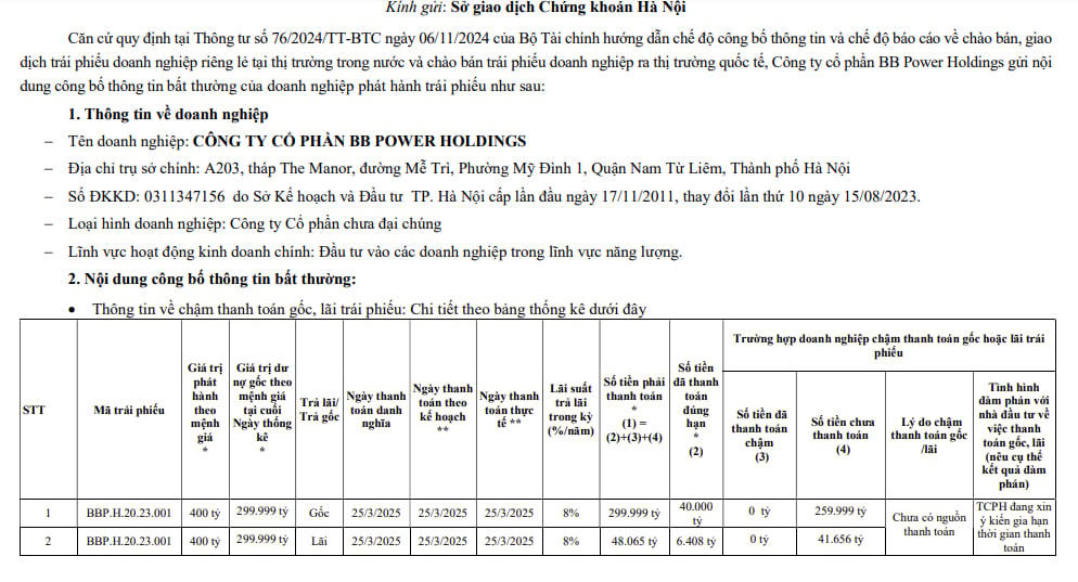 Không chỉ vi phạm hành chính, BB Power Holdings cũng không thể thanh toán đầy đủ gốc và lãi cho hai lô trái phiếu mã BBP.H.20.23.001, đáo hạn vào ngày 25/3/2025. Tổng số tiền chưa thanh toán là hơn 301,655 tỷ đồng. Tổng giá trị hai lô trái phiếu còn lưu hành gần 600 tỷ đồng. Lý do công ty đưa ra là chưa có nguồn thanh toán.