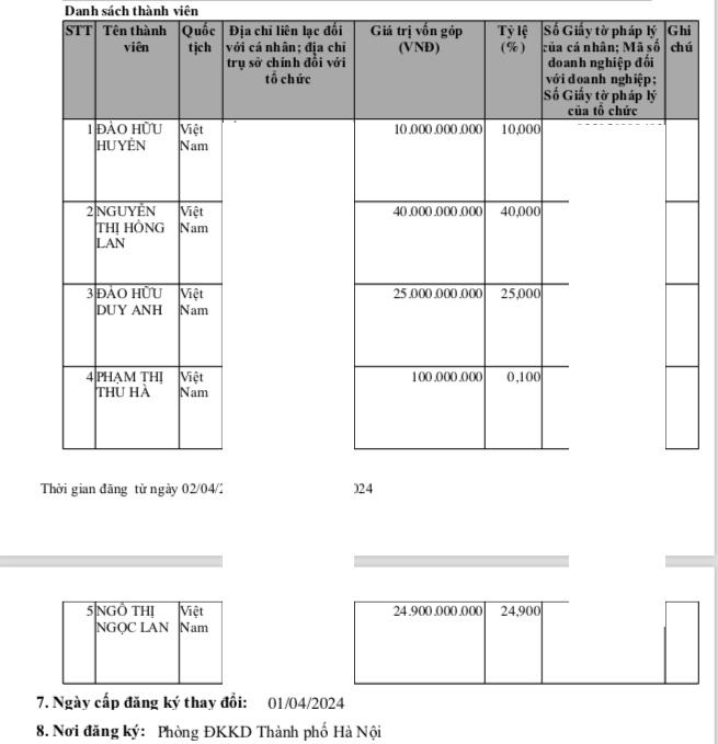 Tới tháng 8/2021, công ty nâng vốn điều lệ lên 100 tỷ đồng. Thành viên góp vốn lúc này gồm: Đào Hữu Huyền góp 10 tỷ đồng (tỷ lệ 10%); Nguyễn Thị Hồng Lan góp 40 tỷ đồng (tỷ lệ 40%); Đào Hữu Duy Anh góp 25 tỷ đồng (tỷ lệ 25%); Phạm Thị Thu Hà góp 100 triệu đồng (0,1%); Ngô Thị Ngọc Lan góp 24,9 tỷ đồng (tỷ lệ 24,9%).