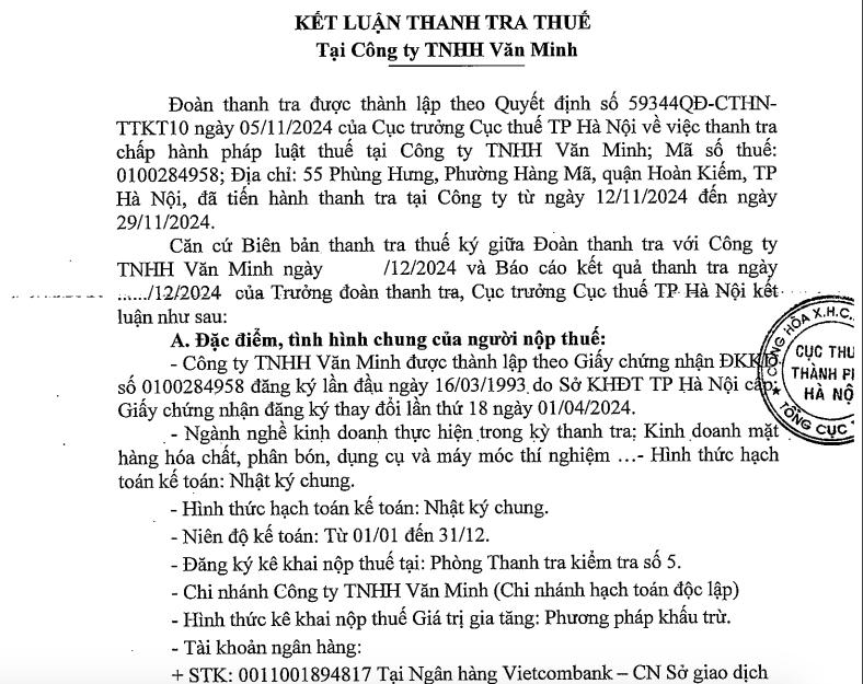 Cục thuế TP Hà Nội vừa công khai kết luận thanh tra thuế tại Công ty TNHH Văn Minh, địa chỉ số 55 Phùng Hưng, phường Hàng Mã, quận Hoàn Kiếm, TP Hà Nội. Thời gian thanh tra công ty từ ngày 12/11/2024 đến ngày 29/11/2024.