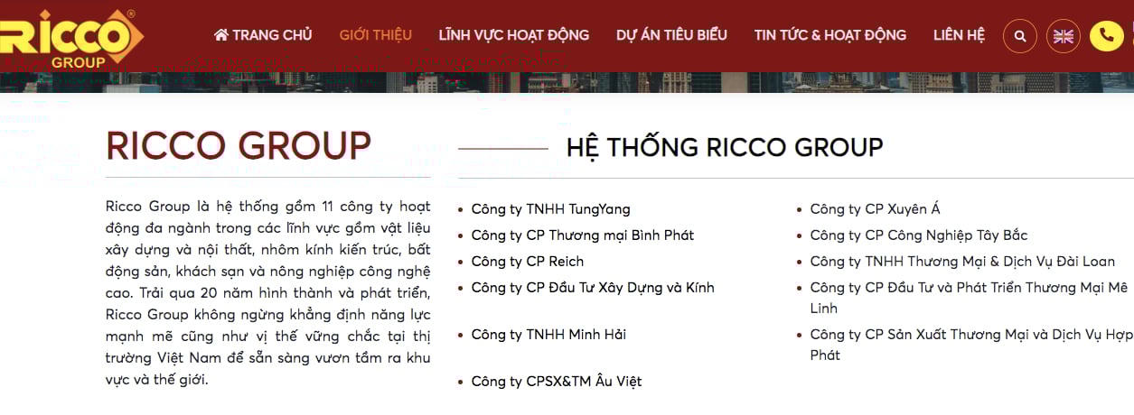 Đáng chú ý, trong lĩnh vực khu đô thị của Ricco Group nổi bật với dự án Khu dịch vụ và biệt thự nhà vườn tại huyện Mê Linh, Hà Nội do Công ty cổ phần Đầu tư và phát triển Thương mại Mê Linh, thuộc hệ thống Ricco phát triển có tổng vốn đầu tư 190,5 tỷ đồng.