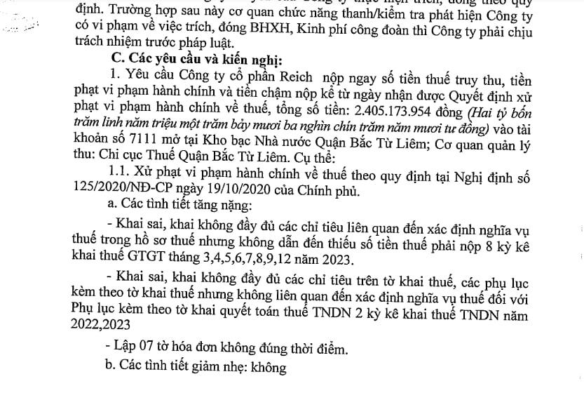 Theo đó, cơ quan thuế yêu cầu Công ty cổ phần Reich nộp ngay số tiền thuế truy thu, tiền phạt vi phạm hành chính và tiền chậm nộp kể từ ngày nhận được quyết định xử phạt vi phạm hành chính về thuế, tổng số tiền hơn 2,4 tỷ đồng.