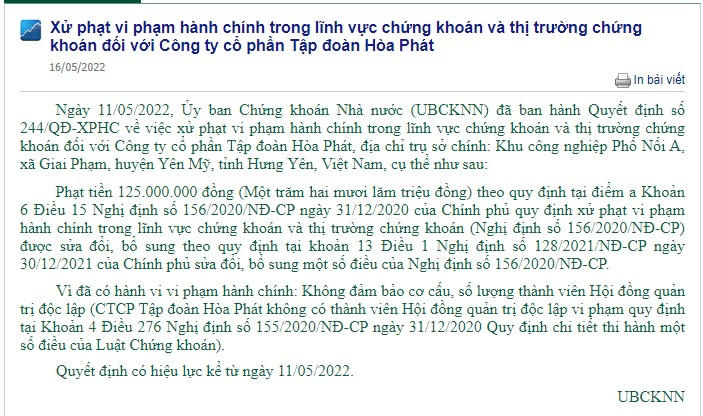 Theo đó, HPG bị phạt tiền 125 triệu đồng do không đảm bảo cơ cấu, số lượng thành viên Hội đồng quản trị độc lập. Quyết định có hiệu lực kể từ ngày 11/05/2022.