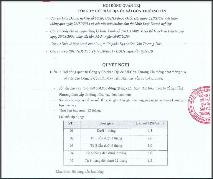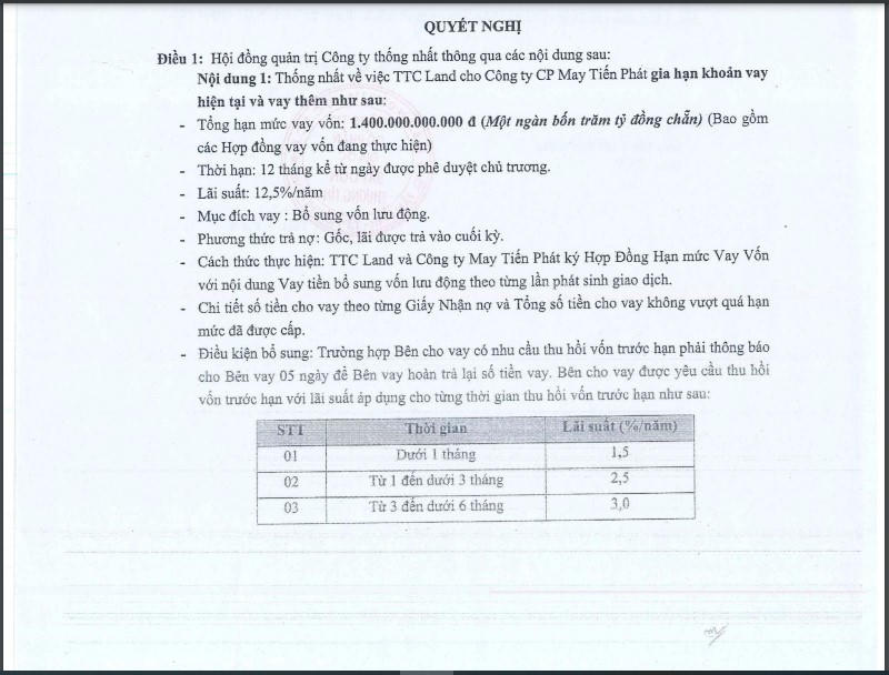 Cụ thể, phạt tiền 85 triệu đồng quy định tại điểm a khoản 4 Điều 42 Nghị định số 156/2020/NĐ-CP ngày 31/12/2020 của Chính phủ quy định xử phạt vi phạm hành chính trong lĩnh vực chứng khoán và thị trường chứng khoán (Nghị định số 156/2020/NĐ-CP) do không công bố đối với thông tin phải công bố theo quy định pháp luật (Công ty không công bố thông tin (CBTT) trên hệ thống CBTT của UBCKNN, trang thông tin điện tử của Sở Giao dịch chứng khoán Thành phố Hồ Chí Minh (HSX) và của Công ty các Nghị quyết Hội đồng quản trị (HĐQT) số: 31/2020/NQ-HĐQT ngày 03/08/2020 về việc thông qua việc chuyển nhượng cổ phần CTCP Mai Lan; số 31A/2020/NQ-HĐQT ngày 14/08/2020 về việc góp vốn đầu tư, hợp tác kinh doanh cùng CTCP Toàn Hải Vân triển khai dự án; số 37/2020/NQ-HĐQT ngày 23/09/2020 về việc CTCP May Tiến Phát vay vốn; số 41A/2020/NQ-HĐQT ngày 20/10/2020 về việc CTCP May Tiến Phát vay vốn;