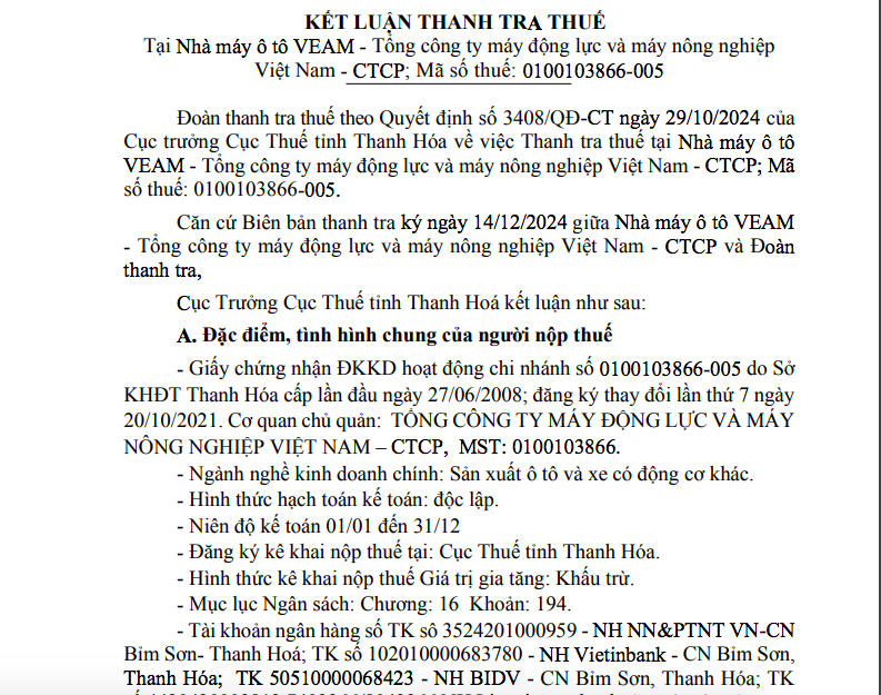 Cục thuế tỉnh Thanh Hoá vừa có kết luận thanh tra thuế tại Nhà máy ô tô VEAM – Tổng công ty Máy động lực và máy nông nghiệp Việt Nam – CTCP.