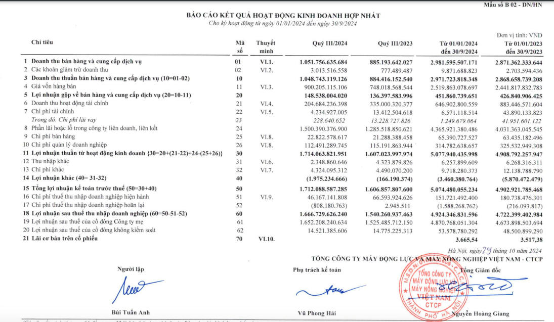 Về kết quả kinh doanh, theo báo cáo tài chính hợp nhất quý III/2024 của Tổng công ty Máy động lực và Máy nông nghiệp Việt Nam - CTCP (VEAM) công bố, doanh thu của công ty ghi nhận trong kỳ đạt hơn 1.051,7 tỷ đồng; tăng 18,8% so với cùng kỳ năm ngoái. Lợi nhuận gộp đạt hơn 148,5 tỷ đồng, tăng gần 10% so với cùng kỳ năm 2023.