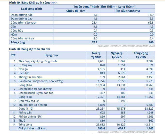 Dựa trên thống kê chi phí thực nghiệm của JICA, FNS ước tính tổng chi phí cho mỗi km tuyến Long Thành vào khoảng 1.145 tỷ đồng, trong đó chi phí xây dựng công trình, đường ray, nhà ga chiếm 36,48%, tương đương 417,5 tỷ đồng/km. Riêng tuyến Bắc - Nam dài 1.559km, tổng chi phí xây dựng có thể lên đến 650.907 tỷ đồng (khoảng 26 tỷ USD).