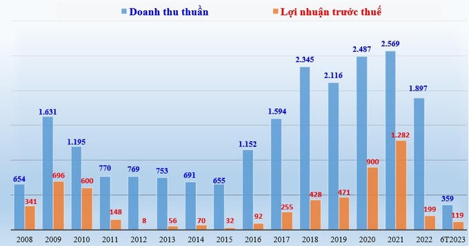 Doanh thu thuần và lợi nhuận trước thuế của DIC Group giai đoạn 2008-2022 và 6 tháng đầu năm 2023 (đơn vị tính: tỷ đồng).
