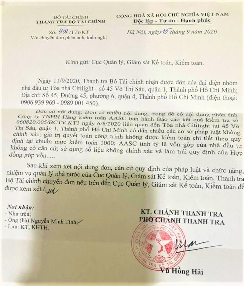 Văn bản trên cho biết, ngày 11/9/2020, Thanh tra Bộ Tài chính nhận được đơn của đại diện nhóm nhà đầu tư Tòa nhà Citilight. Đơn có nhiều nội dung, trong đó có nội dung phản ánh Công ty TNHH Hãng kiểm toán AASC ban hành báo cáo kết quả kiểm tra số 060820.005/BCTV.KT1, ngày 6/8/2020 liên quan đến Tòa nhà Citilight, có dẫn chiếu các cơ sở pháp lý không chính xác; giá trị quyết toán công trình không được kiểm toán chi tiết theo quy định tại chuẩn mực kiểm toán 1000; AASC tính tỷ lệ góp vốn của nhà đầu tư không có căn cứ, sử dụng số liệu không chính xác và làm trái quy định của hợp đồng góp vốn…