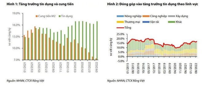 Nhóm phân tích cũng cho biết tăng trưởng cung tiền suy giảm, khi đến cuối tháng 9 chỉ tăng 3,2% so với đầu năm và tăng 7,4% so với cùng kỳ, chưa bằng 1/2 tốc độ tăng trưởng bình quân cung tiền của giai đoạn 2013-2021.
