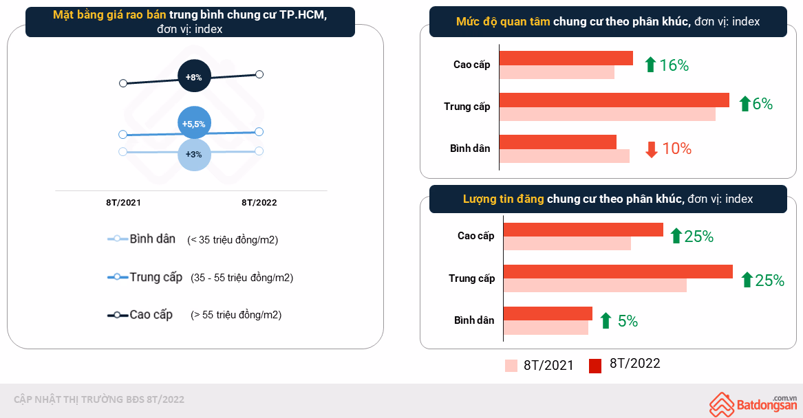 Còn ở TP.HCM, căn hộ cao cấp (55 triệu đồng/m2) đứng đầu về tốc độ tăng giá rao bán, mức độ quan tâm và cả số lượng tin đăng. Cụ thể, giá rao bán chung cư cao cấp TP.HCM tăng 8%, lượt tìm mua tăng 16% và lượng tin đăng tăng đến 25%.