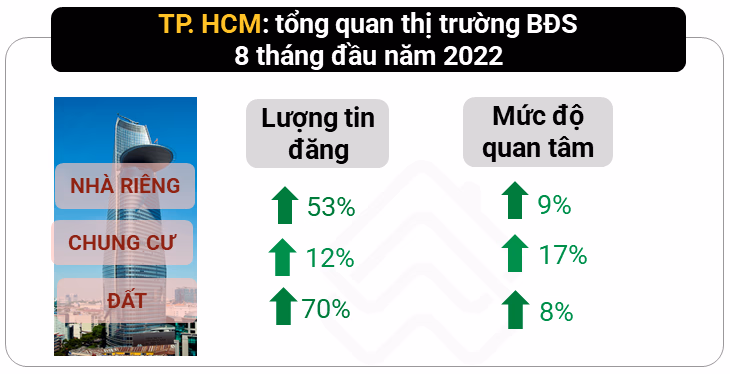 Theo dữ liệu lớn của Batdongsan.com.vn, mức độ quan tâm đến bất động sản (BĐS) tại TP.HCM trong 8 tháng đầu năm 2022 tăng 17% so với cùng kỳ năm trước, trong khi chỉ số này của Hà Nội là 4%.