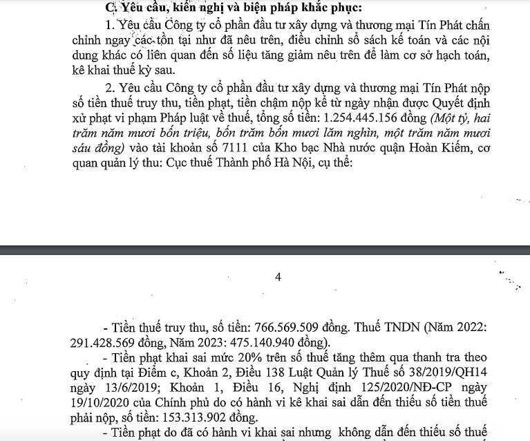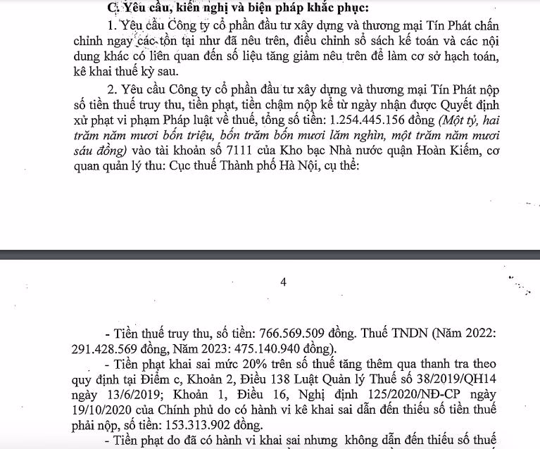 Với những tồn tại nêu trên, Cục thuế TP Hà Nội yêu cầu Công ty Thương mại Tín Phát nộp số tiền thuế truy thu, tiền phạt, tiền chậm nộp kể từ ngày nhận được quyết định xử phạt i phạm pháp luật về thuế, tổng số tiền hơn 1,25 tỷ đồng.