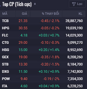 Ở chiều ngược lại, RCL, PPI hay TN1 đều bị kéo xuống mức giá sàn. Các cổ phiếu bất động sản thanh khoản cao giảm giá còn có TIG (-3,5%), KOS (-2,9%), PDR (-2,8%), HDG (-1,1%)...