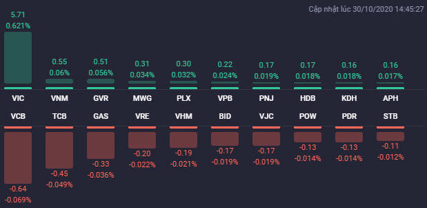 VIC bứt phá trong phiên 30/10 và là nhân tố chủ chốt trong việc kéo VN-Index tăng trở lại vào cuối phiên.