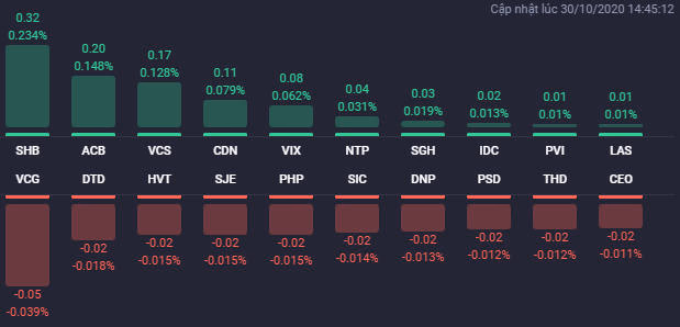 Thị trường chứng khoán phiên 30/10 có biến động tương đối khó chịu. Các chỉ số thị trường hồi phục tốt ở đầu phiên nhờ lực đẩy của một số cổ phiếu trụ cột. Tuy nhiên, áp lực bán nhanh chóng dâng cao đã đẩy hàng loạt mã vốn hóa lớn lao dốc, các chỉ số thị trường vì vậy cũng có sự điều chỉnh nhất định. Biến động của các chỉ số trong phần lớn thời gian giao dịch phiên 30/10 là giằng co trong biên độ hẹp trước sự phân hóa mạnh ở nhóm vốn hóa lớn.