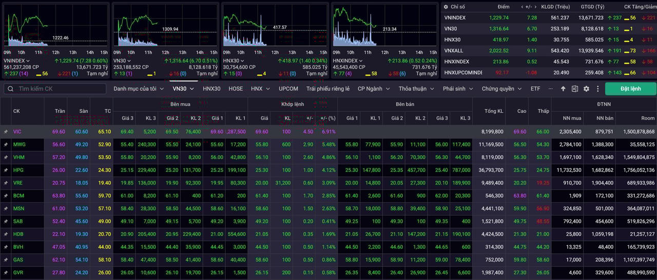 Cùng hệ sinh thái, cổ phiếu VHM và VRE cũng ghi nhận diễn biến tích cực, lần lượt tăng 4,86% và 3,09%. Sự đồng thuận của “bộ ba họ Vin” cùng đà tăng mạnh mẽ từ các mã MWG (+5,48%), HPG (+4,12%), BCM (+2,85%)... góp phần quan trọng giúp chỉ số VN30 giữ được sắc xanh, chốt phiên tại 1.316,64 điểm.