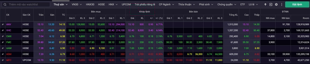 Tại nhóm thủy sản, dòng tiền ổn định giúp nhóm này nối dài nhịp hồi phục. Bộ đôi VHC và ANV đều giữ sắc tím đến hết phiên sáng, trong khi các mã khác như IDI, CMX, FMC đồng loạt tăng từ 2% đến 3,5%.