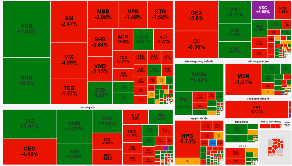 Ngược lại, công nghệ thông tin và chứng khoán là hai nhóm chịu áp lực điều chỉnh. FPT (-2,06%), SSI (-2,47%), VND (-2,15%), VIX (-4,89%) đồng loạt giảm khi nhà đầu tư có xu hướng chốt lời ngắn hạn sau đợt tăng mạnh trước đó.