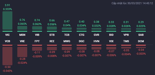 Thị trường chứng khoán phiên 30/3 ghi nhận đà tăng mạnh của VN-Index và HNX-Index trước sự bứt phá của nhóm cổ phiếu ngân hàng cùng một số cổ phiếu trụ cột như VIC, MSN...