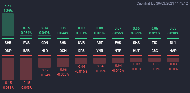 Bên cạnh VIC, tâm điểm của thị trường phiên 30/3 tập trung vào nhóm cổ phiếu ngân hàng. Trong đó, 3 cổ phiếu SHB, STB và SSB đều được kéo lên mức giá trần. SSB đã có phiên tăng trần thứ 5 liên tiếp, đây cũng là cổ phiếu ngân hàng duy nhất tăng trần 5 phiên liên tiếp khi lên giao dịch trên thị trường chứng khoán. SHB cũng đã có 3 phiên tăng trần liên tiếp với khối lượng khớp lệnh đều trên 44 triệu cổ phiếu/phiên. STB là cái tên gây chú ý nhất nhóm này khi bất ngờ tăng trần lên 20.500 đồng/cp và khớp lệnh kỷ lục gần 100 triệu cổ phiếu. Các cổ phiếu ngân hàng khác như VIB, TPB, TCB… cũng tăng giá tốt.