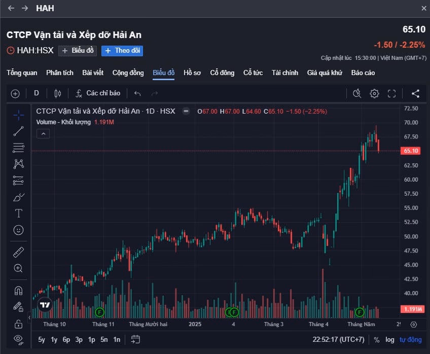 Giữa lúc Viconship mạnh tay gom hàng, cổ phiếu HAH đang tăng giá mạnh. Kết thúc phiên giao dịch ngày 15/5, cổ phiếu HAH giảm nhẹ, đạt mức 65.100 đồng/cổ phiếu. Tính từ đầu tháng 4 đến nay, mã này đã tăng khoảng 50%.