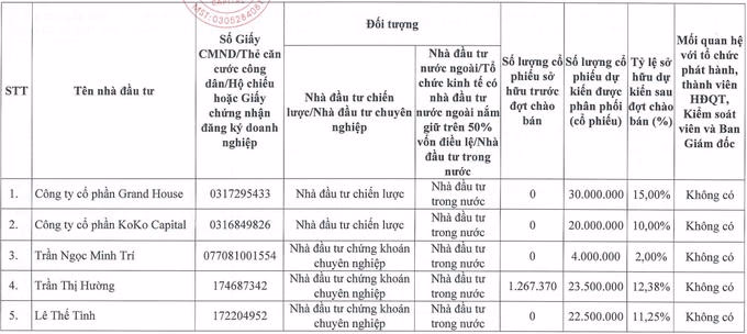 Theo đó, nhà đầu tư chiến lược là CTCP Grand House và CTCP Koko Capital sẽ mua lần lượt 30 triệu cổ phiếu (tỷ lệ sở hữu dự kiến sau đợt chào bán là 15%) và 20 triệu cổ phiếu (10%).