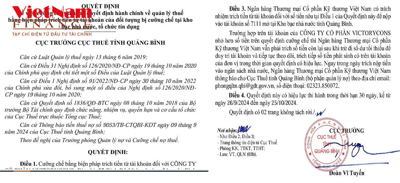 Theo Cục thuế tỉnh Quảng Bình, lý do cưỡng chế thuế bằng biện pháp trích tiền từ tài khoản đối với Công ty cổ phần VictoryCons là do doanh nghiệp này có số tiền quá hạn nộp phải thực hiện cưỡng chế theo quy định tại Luật Quản lý thuế ngày 13/6/2019. Số tiền bị cưỡng chế là 101.010.859 đồng; Quyết định có hiệu lực thi hành trong thời hạn 30 ngày, kể từ ngày 26/9/2024 đến ngày 25/10/2024.