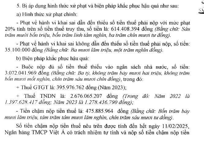 Đồng thời, VietABank phải nộp đủ số thuế còn thiếu vào ngân sách, tổng cộng hơn 3,07 tỷ đồng. Trong đó, gồm gần 396 triệu đồng thuế VAT năm 2023; gần 2,68 tỷ đồng thuế thu nhập doanh nghiệp (TNDN) năm 2022 và 2023; gần 476 triệu đồng tiền chậm nộp thuế.