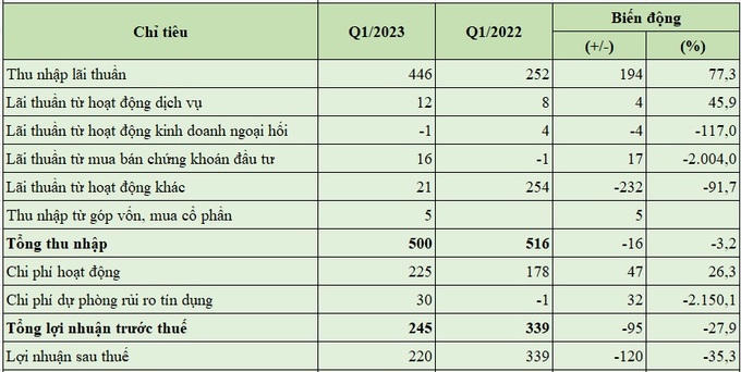 Quý 1/2022, VietABank ghi nhận 1 tỷ đồng hoàn nhập dự phòng nhưng quý 1/2023 chi phí dự phòng rủi ro tín dụng lên tới 30 tỷ đồng. Bên cạnh, chi phí hoạt động tăng 26,3% YoY (+47 tỷ đồng) nên lợi nhuận trước thuế của VietABank trong quý 1 vừa qua giảm 27,9% YoY (-95 tỷ đồng), đạt 245 tỷ đồng.