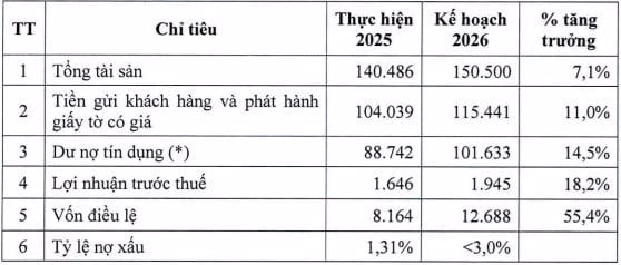 Dư nợ tín dụng đạt 101.633 tỷ đồng, tăng 14,5% (+12.891 tỷ đồng). Dư nợ tín dụng kế hoạch năm 2026 có thể thay đổi phụ thuộc theo hạn mức tăng trưởng tín dụng do Ngân hàng Nhà nước giao. Tỷ lệ nợ xấu dưới 3%.