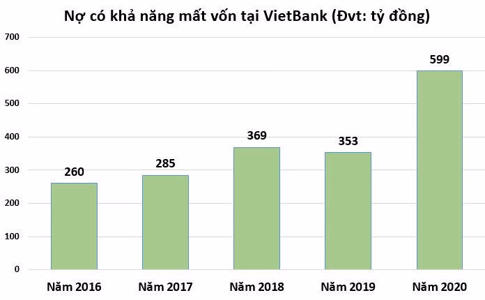 Phân tích nợ xấu của Vietbank tính đến 31/12/2020, theo BCTC hợp nhất quý 4/2020, tổng nợ xấu tăng 46% so với đầu năm, lên mức gần 785 tỷ đồng. Trong đó, nợ có khả năng mất vốn (nợ nhóm 5) tăng mạnh nhất với 69% lên mức 599 tỷ đồng; nợ dưới tiêu chuẩn tăng nhẹ 8%, ở mức 94 tỷ đồng. Dẫn đến tỷ lệ nợ xấu của Vietbank tăng từ mức 1,32% lên 1,75%.