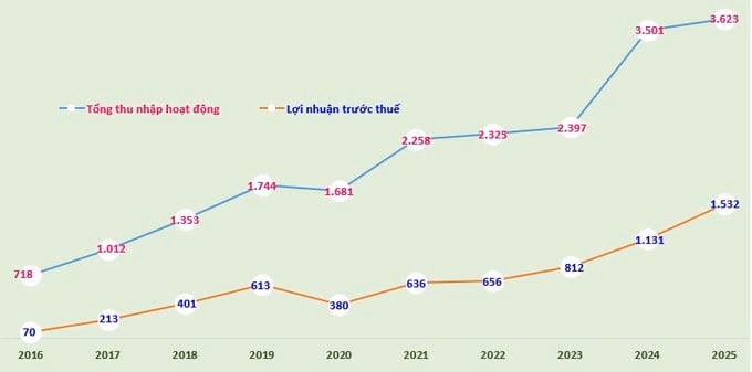 Kết thúc năm 2025, tổng thu nhập hoạt động của Vietbank tăng 3,5% (+160 tỷ đồng) so cùng kỳ năm trước, đạt 3.623 tỷ đồng.